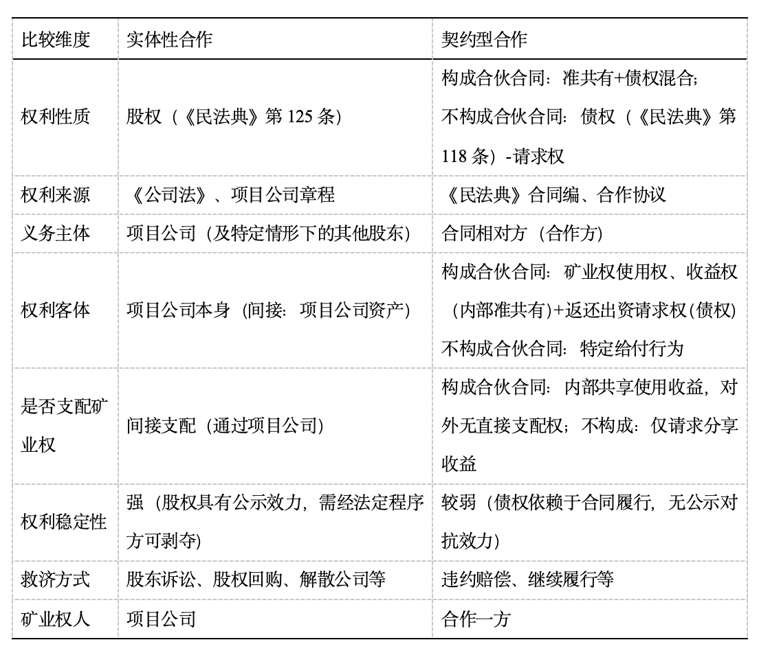 上述分析可见,实体性合作模式和契约型合作模式下,合作各方的权利性质、法律依据、行权路径和救济均存在明显差异,本文试从以下维度进行比较,便于读者直观理解其中的差异:
