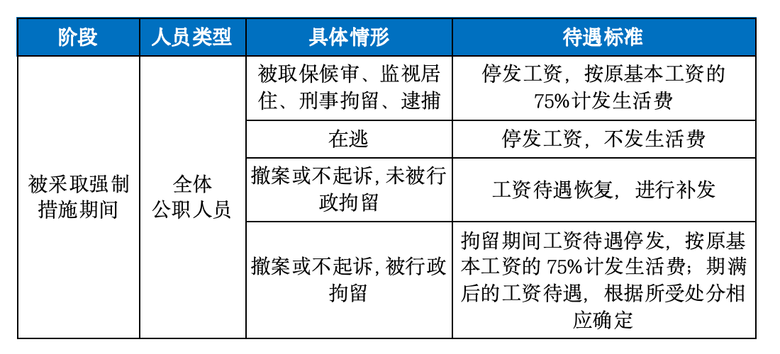 公职人员被采取强制措施,是指公职人员涉嫌刑事犯罪,在刑事诉讼过程中为防止逃跑、串供、毁灭证据等有碍侦查行为发生、确保诉讼活动正常进行而对其采取的取保候审、监视居住、刑事拘留、逮捕等措施。在此期间,相关人员的人身自由受限,无法正常工作、履行公职,因此,此阶段的工资待遇停发。但该阶段不会剥夺全部的收入来源,按照规定,应按其原基本工资的75%计发生活费,此阶段不计算工作年限。
