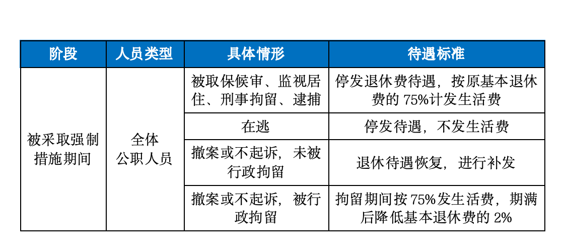 需注意,退休人员被留置期间的退休待遇,目前无明确法律规定,实践中既有停发的情况,也有参照上述标准执行的情况,需结合具体案件进行判断。