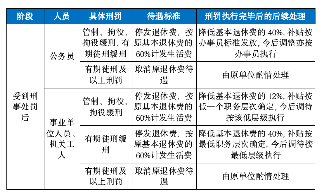 上述人员退休后被判处管制、拘役或拘役被宣告缓刑期间,退休费待遇停发,按本人原基本退休费的60%计发生活费。刑罚执行完毕或缓刑考验期满,按12%降低基本退休费,补贴按低一个职务层次(技术等级)确定。今后国家调整退休费时,按原执行退休待遇职务层次(技术等级)的低一个职务层次(技术等级)的标准执行。