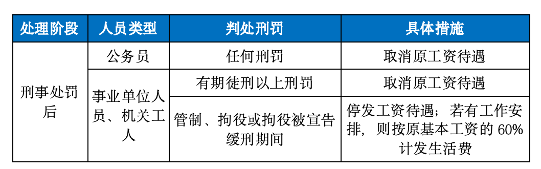 如果是事业单位工作人员和机关工人,法律规定则更为细化。若被判处有期徒刑以上刑事处罚,从人民法院判决生效之日起,取消原工资待遇。被判处管制、拘役或拘役被宣告缓刑期间,工资待遇停发,不计算工作年限。在拘役被宣告缓刑期间安排了临时工作的,按本人基本工资的60%计发生活费。期满后的工资待遇,根据所受处分相应确定。