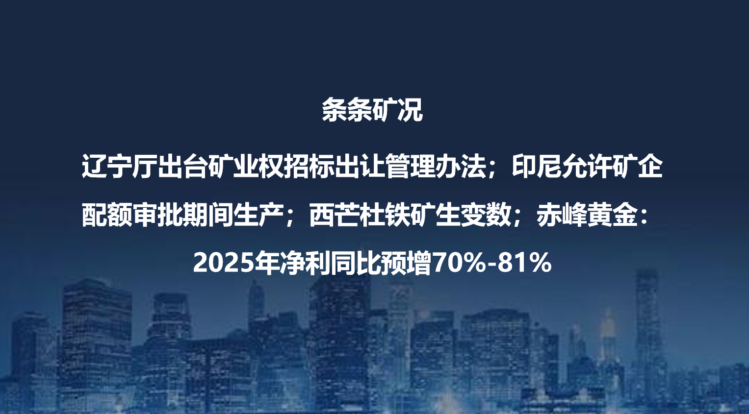 条条矿况|辽宁厅出台矿业权招标出让管理办法;印尼允许矿企配额审批期间生产;西芒杜铁矿生变数;赤峰黄金:2025年净利同比预增70%-81%
