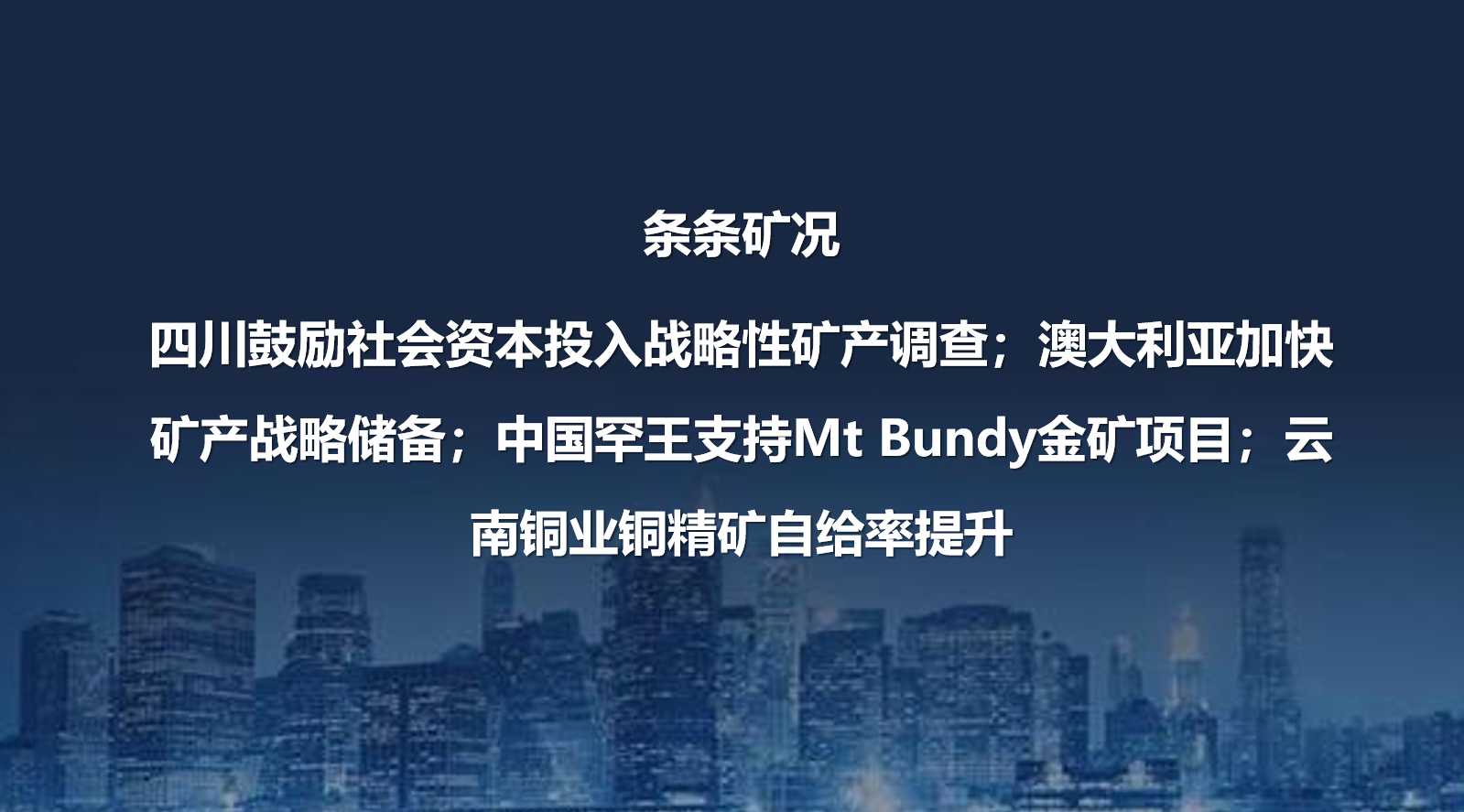 条条矿况|四川鼓励社会资本投入战略性矿产调查;澳大利亚加快矿产战略储备;中国罕王支持Mt Bundy金矿项目;云南铜业铜精矿自给率提升