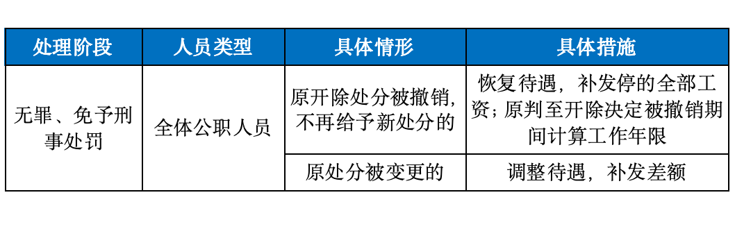 首先,涉案人员若被确定无罪或免予刑事处罚,原处分应当被撤销。原处分基于原刑事处罚做出,在刑事处罚有所变动时,基于此作出的处分也就失去了合法基础。在该条件下,公职人员的工资待遇则与处分撤销后的决定息息相关。