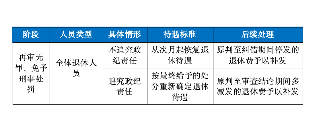 对于不追究违纪责任的,从再审宣告无罪或免予刑事处罚的次月起恢复退休费待遇。原判至宣告无罪或免予刑事处罚期间,被停发的退休费由单位补发。若被追究违纪责任,则根据应给予的处分相应确定退休费待遇,从审查结论作出的次月起执行。原判至作出审查结论期间,被多减发的退休费由单位补发。